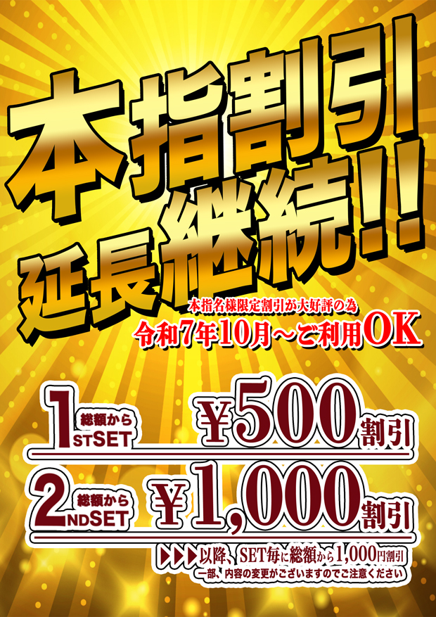 期間限定で本指名のお客様にだけお得な割引をご用意した「本指名割引!」のご紹介です。オキニ彼女と過ごす時間は、まるで普段の疲れやストレスが一気に吹き飛ぶような特別な体験。笑顔で迎えてくれるその瞬間から、あなたの心も身体も一気にリラックスムードに包まれることでしょう。